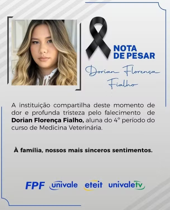 A Univale divulgou nas redes sociais uma nota de pesar pela morte de Dorian.