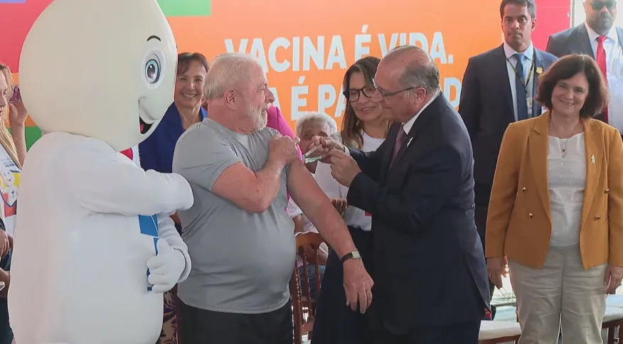 O vice-presidente Geraldo Alckmin (PSB) aplicou a dose de reforço da vacina bivalente contra a Covid-19 no presidente Luiz Inácio Lula da Silva (PT), durante o lançamento do Movimento Nacional pela Vacinação nesta segunda-feira (27).