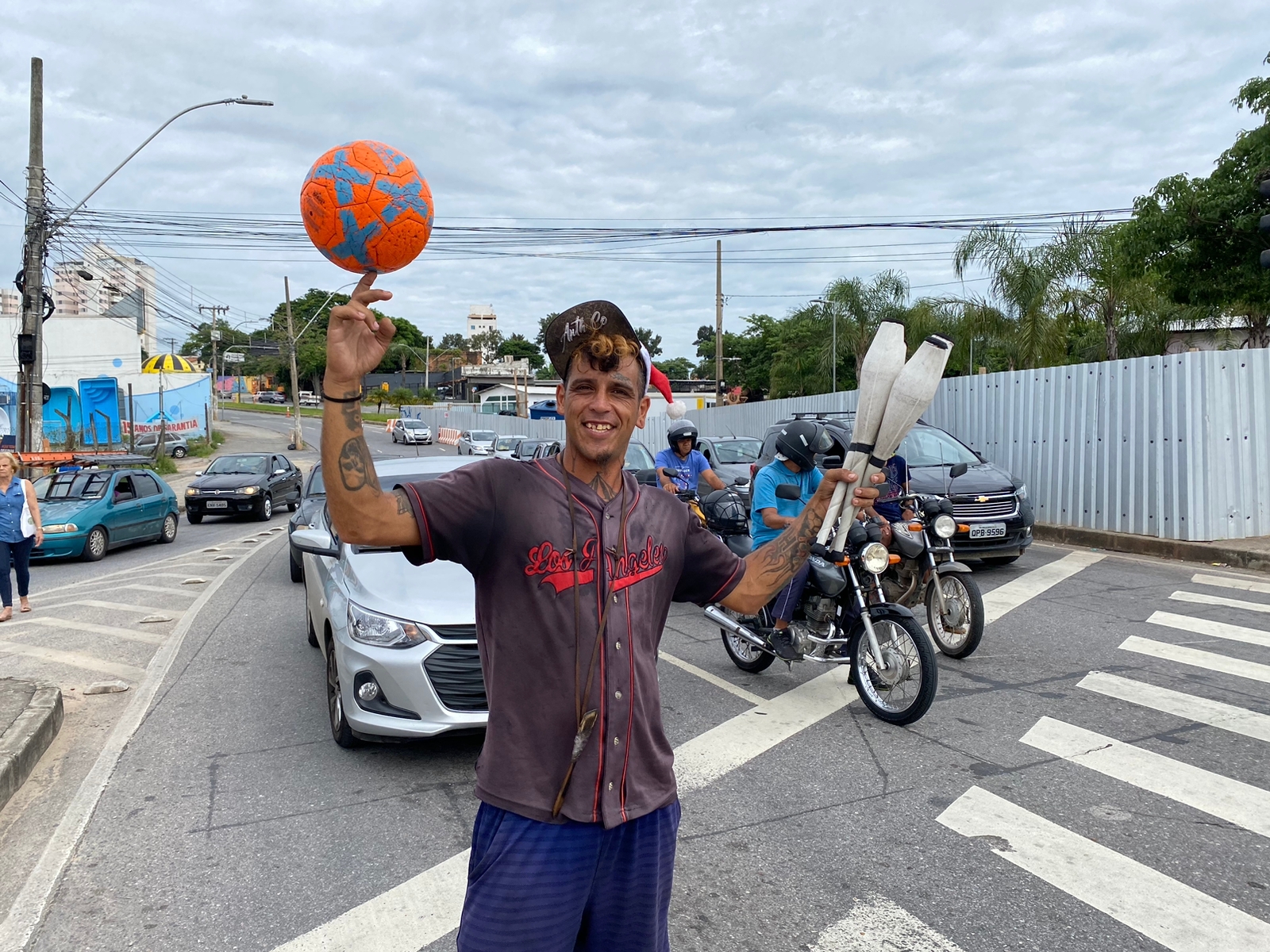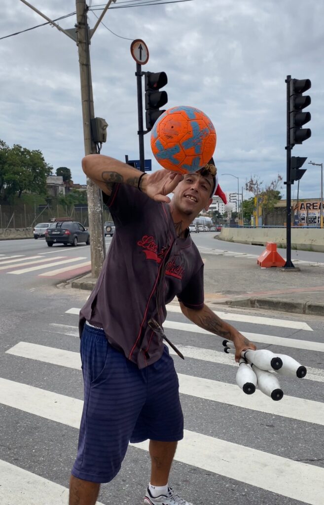Todos os dias ele pega seu instrumento de trabalho, os bastões e a bola e lá vai ele para o semáforo 🚦 onde faz um show de malabarismo, um privilégio pra quem assisti dentro dos poucos minutos de trânsito parado.