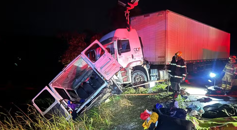 Segundo as primeiras apurações da equipe de perícia da Polícia Civil de Minas Gerais (PCMG), o veículo pesado teria invadido a contramão e colidido com a van, que foi arrastada até a margem da via.