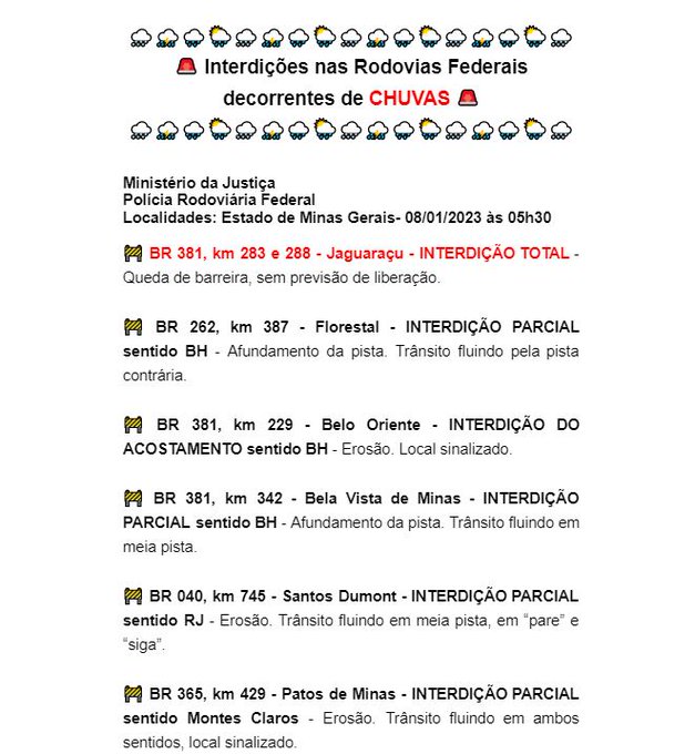 De acordo com a Polícia Rodoviária Federal, além deste trecho, outros cinco pontos contam com interdições decorrentes das chuvas. Na BR-381, também há o registro de interdições parciais no km 299, em Belo Oriente, e no km 342, em Bela Vista de Minas. Os demais pontos são no km 387 da BR-262, em Florestal, no km 475 da BR-040, em Santos Dumont, e no km 429 da BR-365, em Patos de Minas.