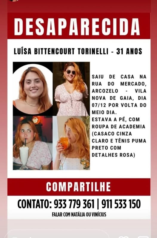 Quem tiver informações sobre o paradeiro de Luísa Bittencourt Torinelli pode entrar em contato pelos telefones +351 933 779 361 ou +351 911 533 150.