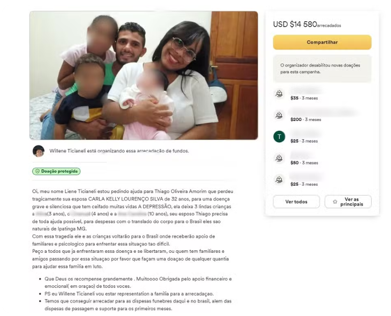 Na campanha, a organizadora mencionou que a morte de Carla teria sido causada por depressão. O objetivo da arrecadação era também custear o transporte de Thiago e das três filhas do casal para Ipatinga, onde receberiam apoio psicológico e o auxílio da família. “Ele e as crianças voltarão ao Brasil para enfrentar essa situação tão difícil”, dizia o texto publicado na vaquinha.