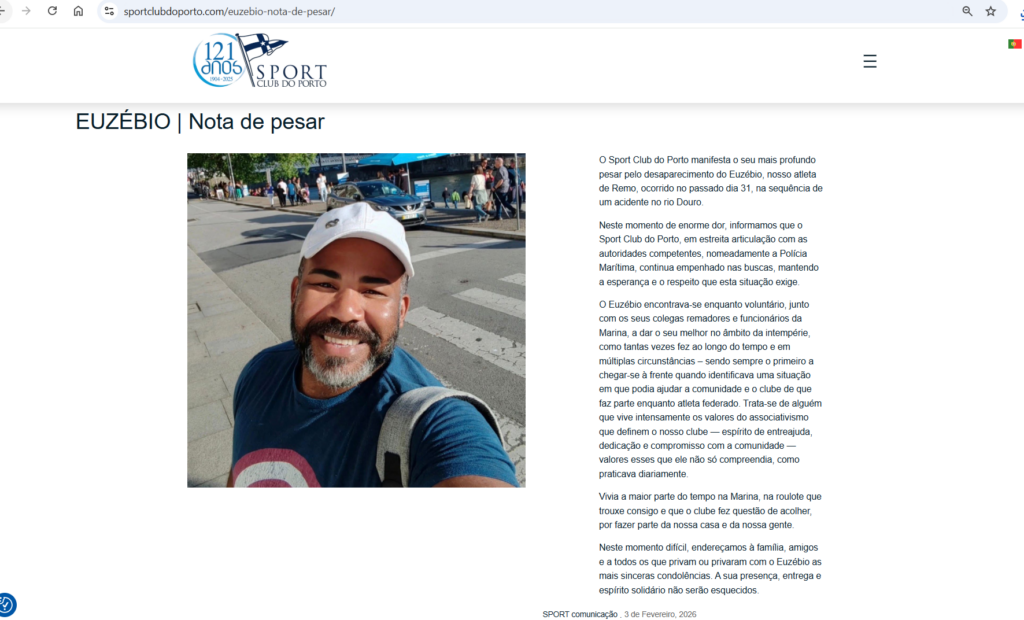 Segue desaparecido em Portugal o brasileiro Euzébio Souza Filho, baiano natural de Salvador, de 43 anos, que caiu no Rio Douro no dia 31 de janeiro, após o barco em que estava naufragar durante uma ação de limpeza em uma marina, na cidade do Porto. A atividade ocorria em meio a condições climáticas adversas provocadas por tempestades que atingiram a região.