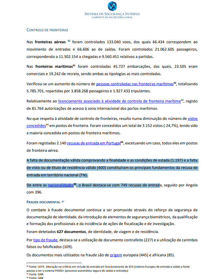 O relatório anual reforça que as recusas de entrada fazem parte dos mecanismos normais de controle migratório e segurança das fronteiras portuguesas.