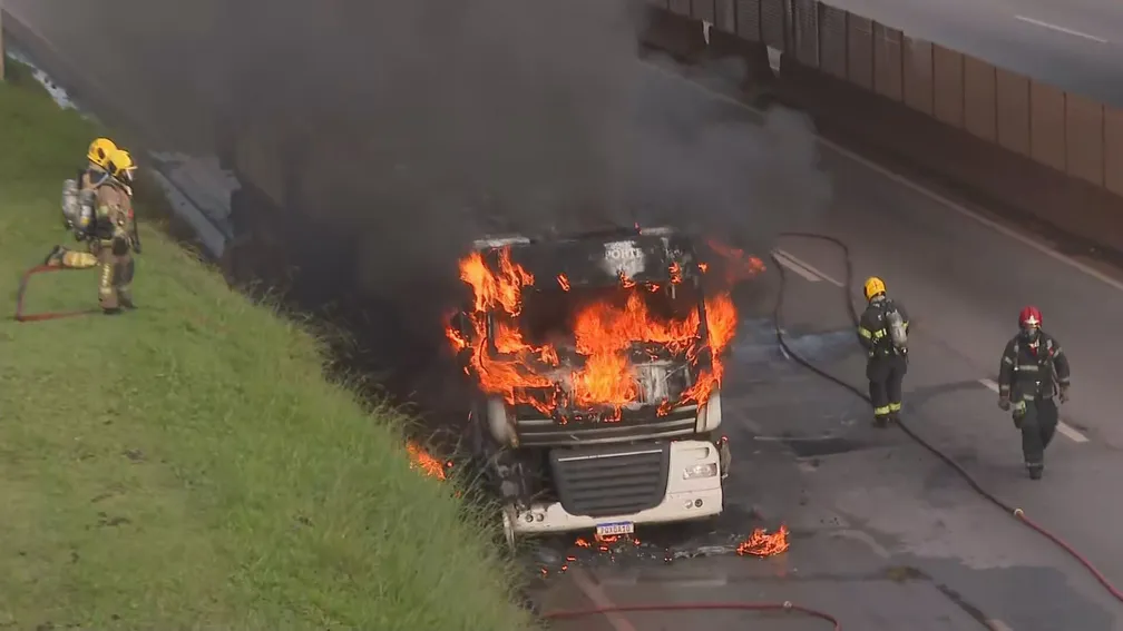 Muita fumaça preta saiu do veículo e a cabine foi destruída pelas chamas.