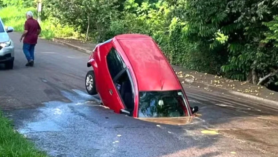 Um pai e seu filho de dois anos passaram por um grande susto na manhã de sexta-feira (21), em Jaguapitã, no norte do Paraná. O carro em que estavam foi parcialmente engolido por um buraco que se abriu repentinamente na rua Hugo Silva Pereira. O asfalto cedeu devido ao rompimento de um cano, tornando a via perigosa para motoristas.
