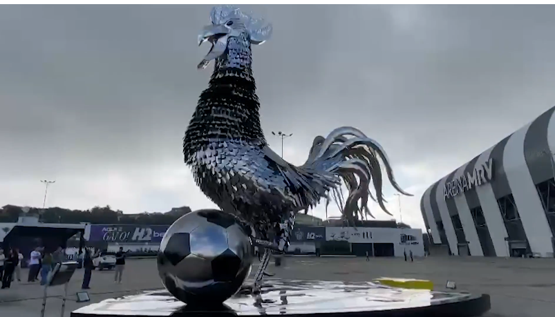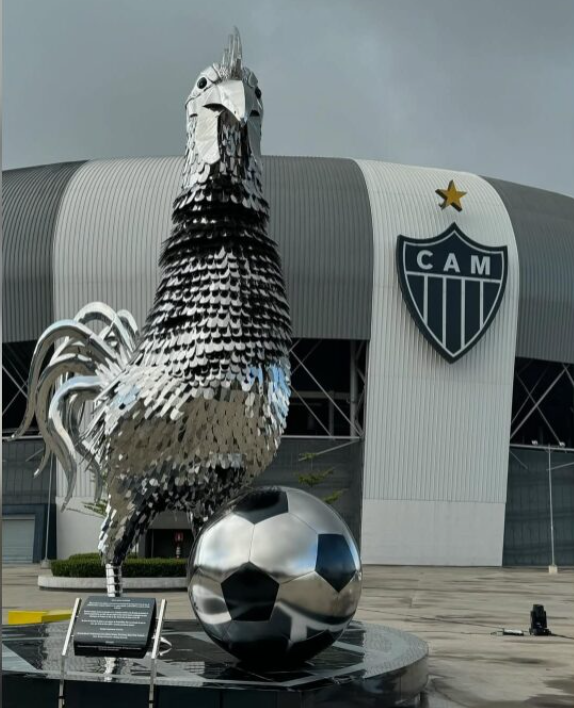 A Arena MRV inaugurou na última terça-feira (29), o “Galo Inox”, que representa o mascote do Atlético-MG e foi instalado na esplanada do estádio, em Belo Horizonte (MG). A obra possui oito metros de altura, 13 toneladas e 4 mil penas de aço.