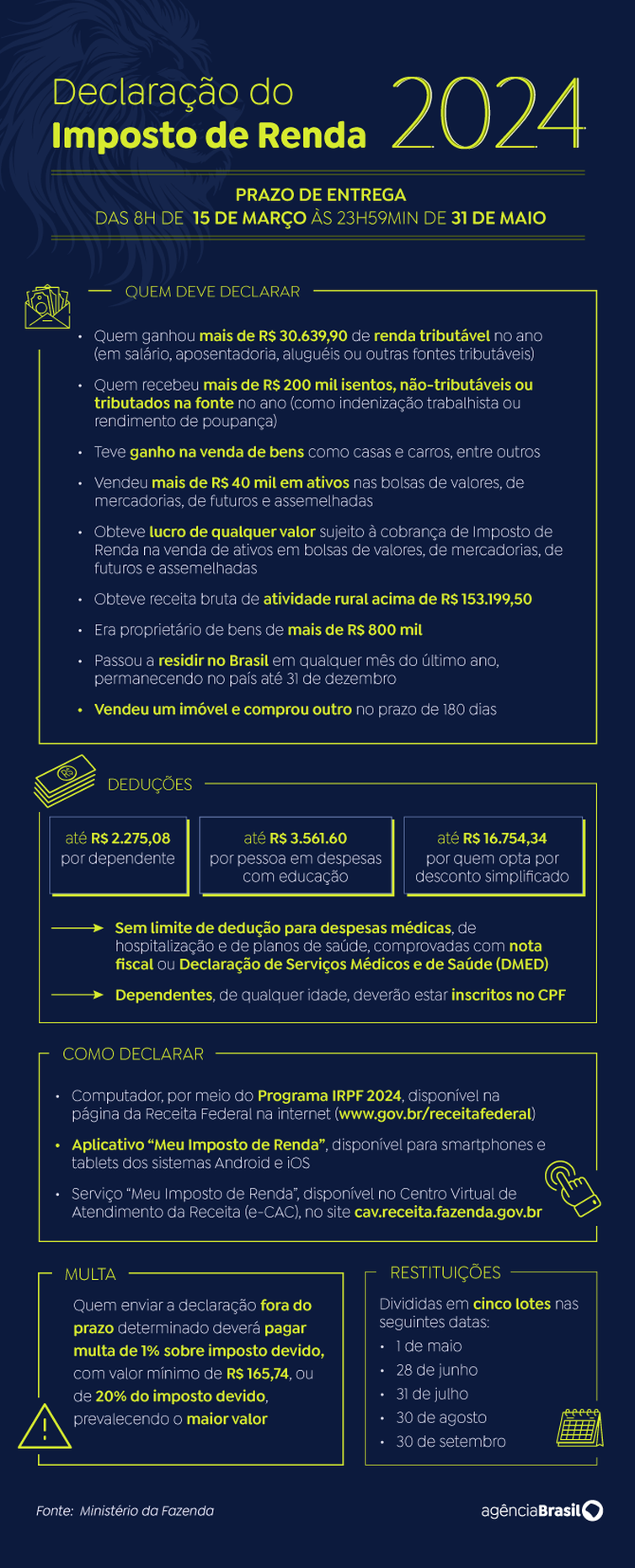 A partir das 10h desta sexta-feira (21), cerca de 5,75 milhões de contribuintes que entregaram a Declaração do Imposto de Renda Pessoa Física saberão se acertaram as contas com o Leão. Nesse horário, a Receita Federal libera a consulta ao segundo dos cinco lotes de restituição de 2024, com a inclusão de cerca de 250 mil contribuintes do Rio Grande do Sul com direito a receber. O lote também contempla restituições residuais de anos anteriores.
