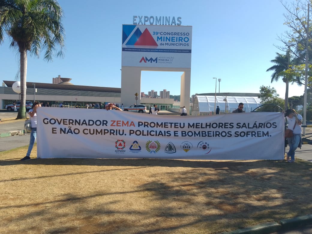 Servidores das forças de segurança de Minas Gerais fazem na manhã desta quarta-feira (05/06) pelo segundo dia consecutivo protesto contra o governador Romeu Zema (Novo) por reajuste salarial. O ato, assim como ocorreu na terça (04/06) é realizado na portaria do Expominas, onde acontece o 39ª edição do Congresso Mineiro de Municípios, organizado pela Associação Mineira de Municípios (AMM).