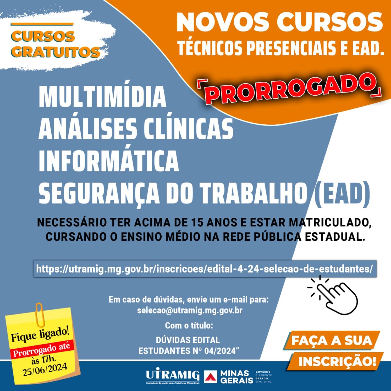 A Fundação de Educação para o Trabalho de Minas Gerais (Utramig) está com inscrições abertas para mais de 200 vagas em cursos técnicos gratuitos. As oportunidades são para os cursos de Análises Clínicas, Segurança do Trabalho, Informática e Multimídia. Além da gratuidade, os estudantes selecionados receberão ajuda de custo para alimentação e transporte.
