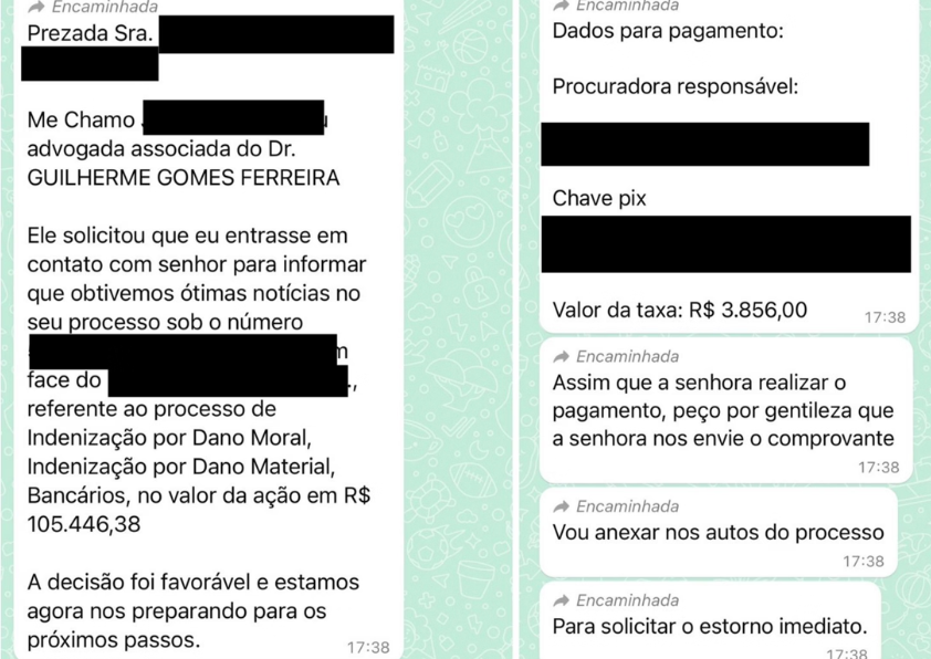 Em meio à expectativa sobre o resultado de um processo com valor de causa de R$ 105 mil, uma senhora de 77 anos recebeu uma mensagem informando que ela havia vencido a ação. A mensagem, enviada por uma mulher se passando por sócia do advogado da cliente, condicionava o recebimento do valor à quitação de uma taxa de R$ 3,8 mil. A quantia parecia baixa, representando apenas 3,6% do valor da causa, e ainda havia a promessa de reembolso. Felizmente, ela entrou em contato com seu advogado e descobriu que se tratava de um golpe.