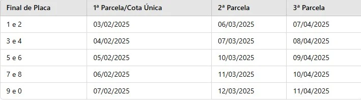 O Governo de Minas Gerais anunciou, nesta sexta-feira (27), o calendário do IPVA 2025, que começa a ser cobrado em fevereiro, de acordo com lei sancionada recentemente. A escala de vencimentos da primeira parcela ou pagamento em cota única ocorrerá entre os dias 3 e 7 de fevereiro, conforme o final da placa do veículo.