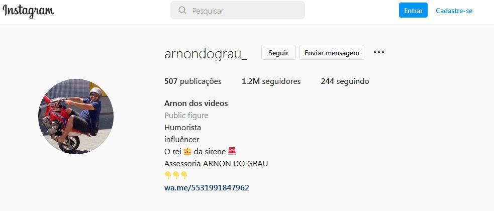 Na foto do perfil da rede social ele aparece empinando uma moto, modalidade conhecida como “grau”.