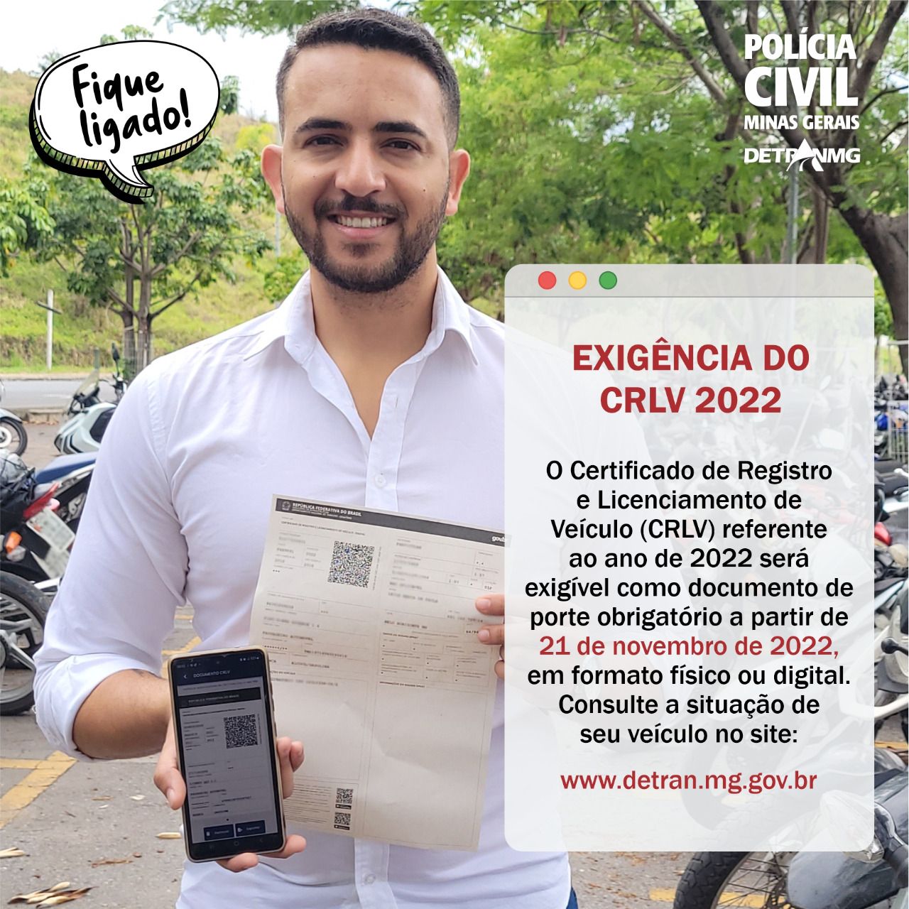 Proprietários de veículos registrados em Minas Gerais devem ficar atentos para o prazo de exigência do Certificado de Registro e Licenciamento de Veículo (CRLV). A partir de 21 de novembro, o CRLV referente ao ano de 2022, no formato digital ou impresso, será considerado o documento válido para comprovar a regularidade do veículo em circulação.