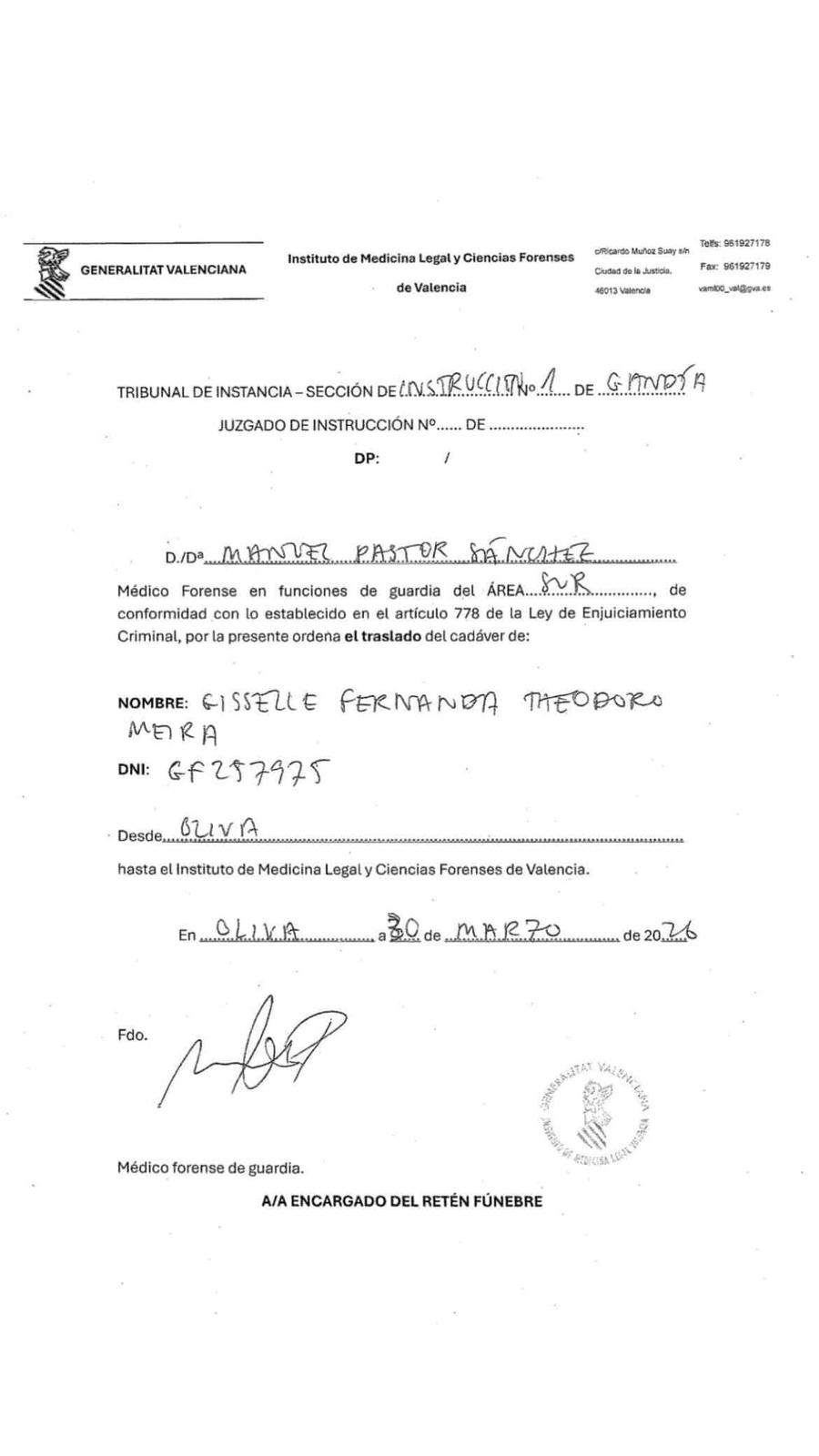 Após a ocorrência, o corpo de Gisele foi transferido para o Instituto Médico Legal localizado na cidade de Oliva, na região de Valência.