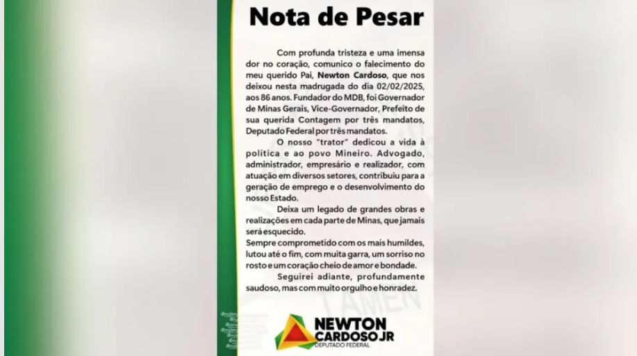 “Com profunda tristeza e uma imensa dor no coração, comunico o falecimento do meu querido Pai, Newton Cardoso (…). O nosso ‘trator’ dedicou a vida à política e ao povo mineiro (…). Sempre comprometido com os mais humildes, lutou até o fim, com muita garra, um sorriso no rosto e um coração cheio de amor e bondade”, escreveu.
