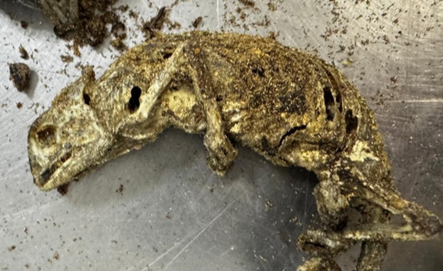 O Ministério da Agricultura e Pecuária (Mapa) identificou uma mala com restos de animais mortos no Aeroporto Internacional de São Paulo, em Guarulhos, nesta semana. Os aparelhos de raio-X identificaram material orgânico na bagagem, despachada da Nigéria, na África e, ao abri-la, os agentes encontraram ratos empalados, morcegos, camaleões, cabeças de cobra, bagres secos e uma cabeça decapitada de cachorro, além de muitas larvas.