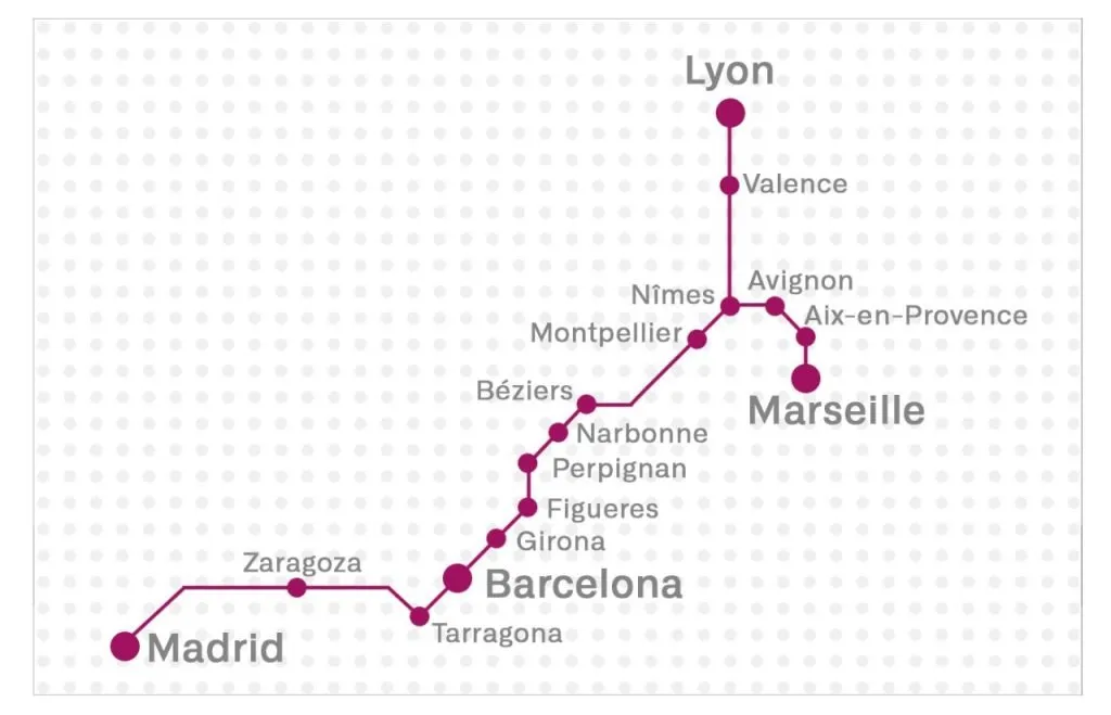 O rota entre Madrid e Marselha vai conectar, a partir de 28 de julho, as estações intermediárias de Guadalajara Yebes, Zaragoza Delicias, Camp de Tarragona, Barcelona Sants, Girona, Figueres Vilafant, Perpignan, Narbona, Béziers, Montpellier-St – Roch, Nîmes, Avignon-TGV, Aix-en-Provence TGV e Marselha-St Charles.