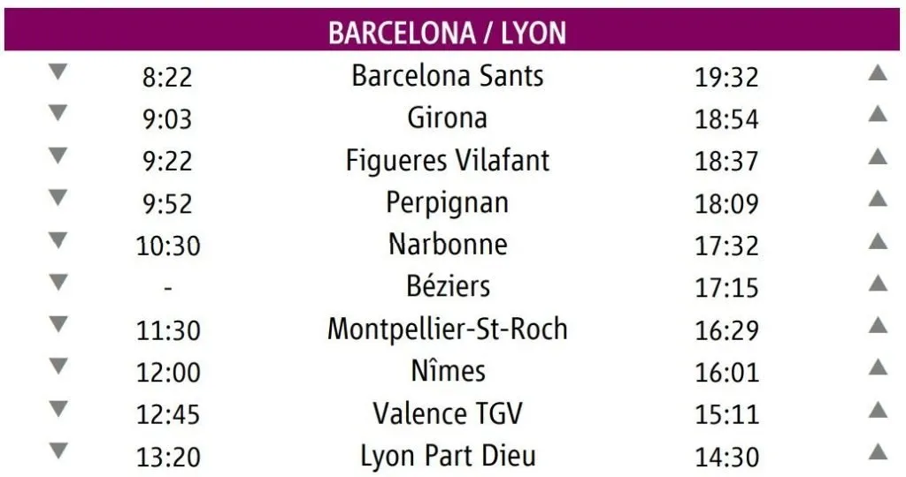 O serviço entre Barcelona e Lyon vai passar pelas estações Barcelona Sants, Girona, Figueres Vilafant, Perpignan, Narbonne, Béziers, Montpellier-St-Roch, Nîmes, Valence TGV e Lyon Part Dieu, saindo de Barcelona às 8h22 da manhã, com retorno de Lyon às 14h30.