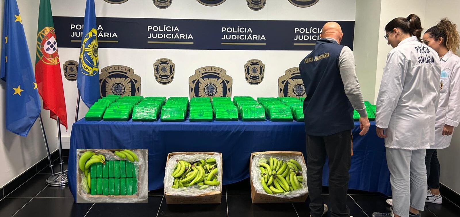 “Identificamos quatro paletes contendo bananas que, no seu interior, dissimulavam uma elevada quantidade de cocaína”, detalhou em entrevista Vítor Ananias, coordenador de investigação criminal da PJ. Segundo ele, em razão do volume de droga encontrado (3,458 toneladas), a cocaína seria certamente distribuída em seguida em outros países.
