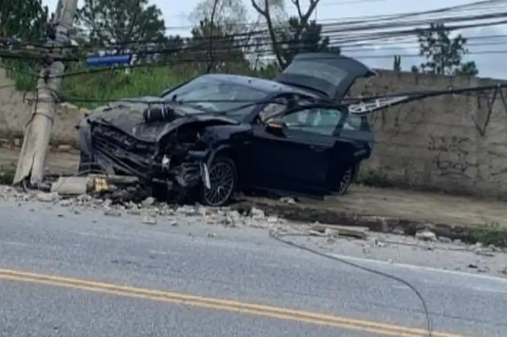 A Polícia Militar (PM) foi acionada até a avenida Presidente Eurico Gaspar Dutra onde os militares encontraram o veículo de luxo, de cor azul escuro, parado em cima da calçada e com a frente destruída. Com o impacto, o poste foi arrancado e acabou ficando pendurado pelos fios de alta tensão.