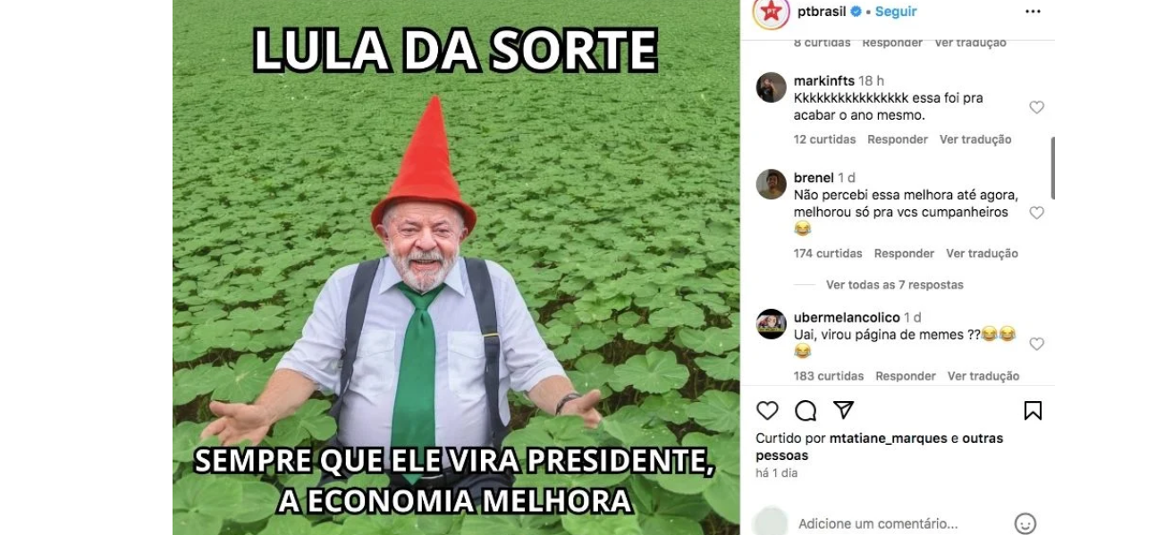Na publicação, uma imagem trazia os dizeres: “Lula da sorte. Sempre que ele vira presidente, a economia melhora.” Na legenda, o partido reforçou a mensagem afirmando que “o que alguns chamam de sorte, outros chamam de trabalho”.