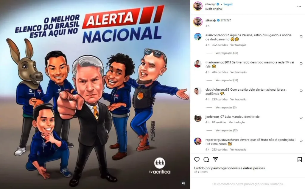A RedeTV! confirmou, por meio de nota oficial, o fim do vínculo com o apresentador Sikêra Jr. A medida contempla também a emissora de TV A Crítica, geradora do programa “Alerta Nacional”, para a transmissão do formato em rede nacional.