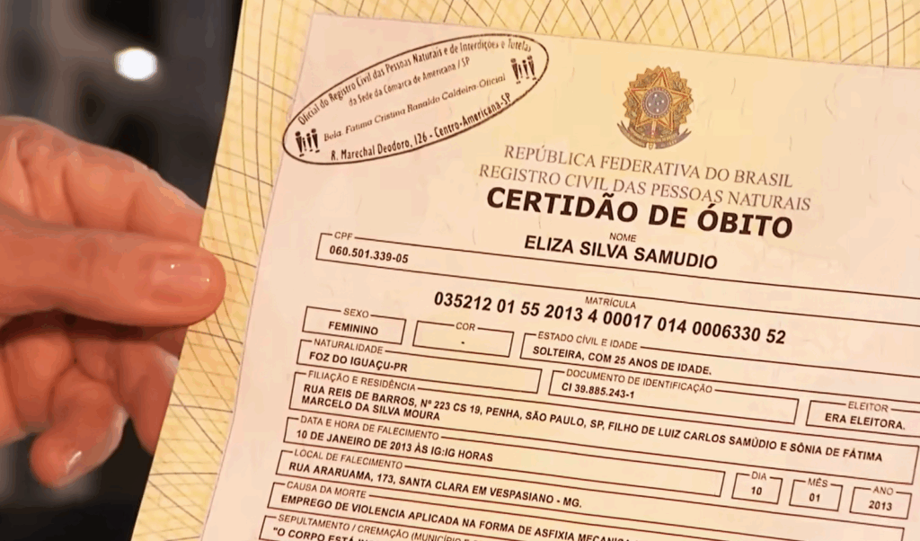 Somente após essa decisão judicial é que o cartório pode registrar oficialmente o óbito, o que explica o intervalo de quase três anos entre a data do crime e a emissão da certidão. O documento, portanto, não indica que Eliza tenha morrido em 2013, mas sim que o falecimento foi formalmente reconhecido naquele ano.