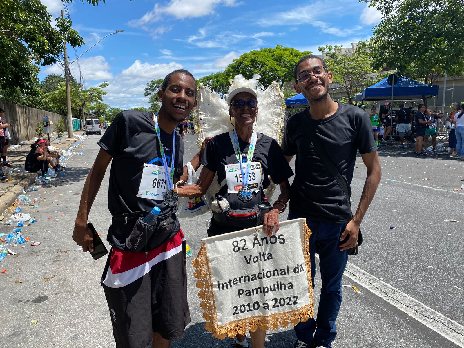 É uma energia tão grande que contagia até os netos. O Bernard de 22 anos e o Álvaro de 23 arriscam correr nas provas juntos com ela. O apoio dos netos é fundamental, é um segundo combustível pra vovó Juliana.